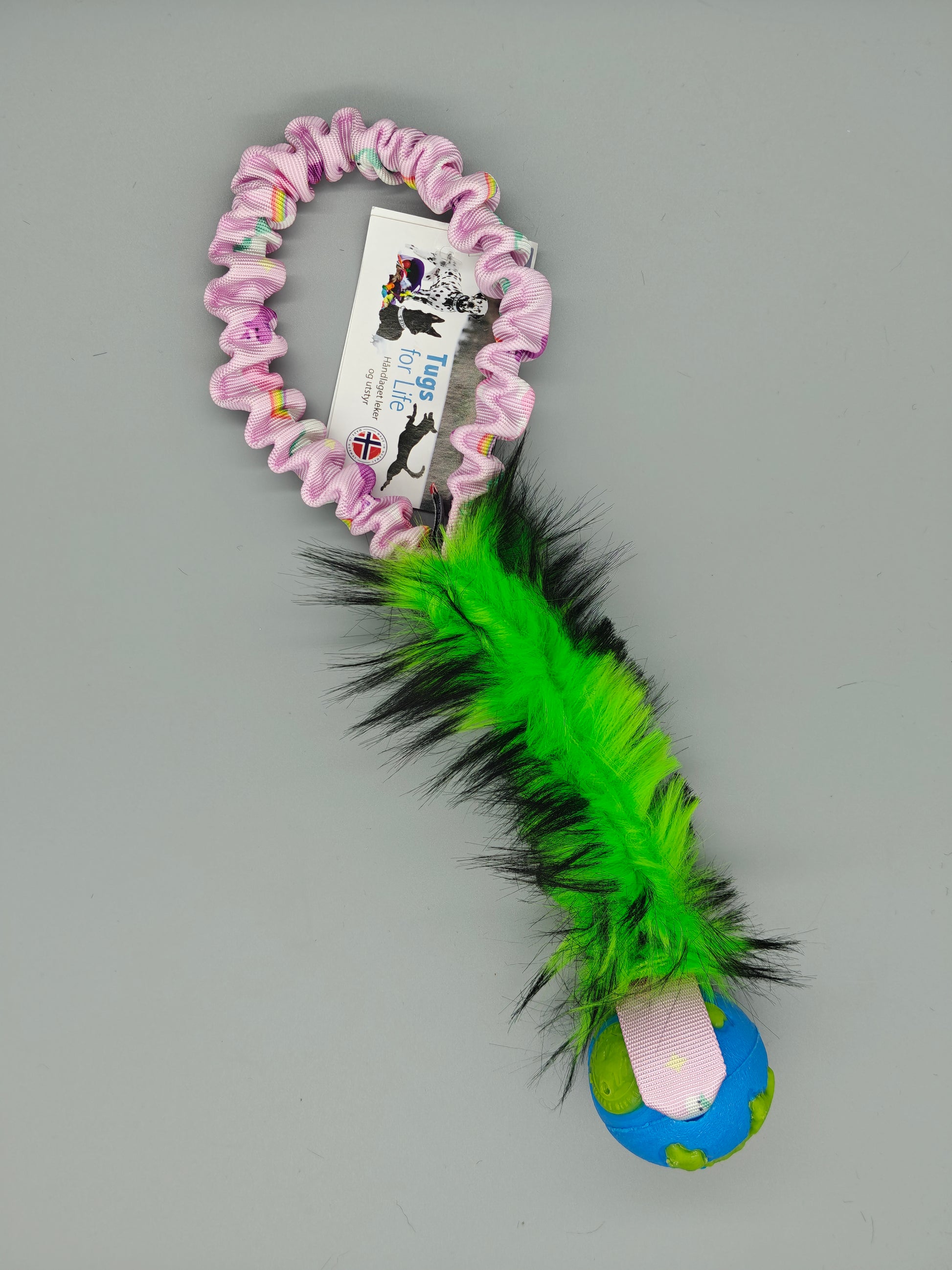 Leke med rundsydd strikk i babyrosa med grønn pels og blå ball.